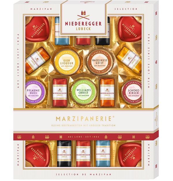 Die edlen Marzipanerien erstrahlen im glamourösen und modernen Design. Die weihnachtlichen Rezepturen wie Bratapfel, Mandel-Karamell, Lebkuchen und Eierpunsch komplementieren die rote Weihnachtswelt von Niederegger. In verschiedenen Verpackungsgrößen ist die Marzipanerie ein ideales Weihnachtsgeschenk.
